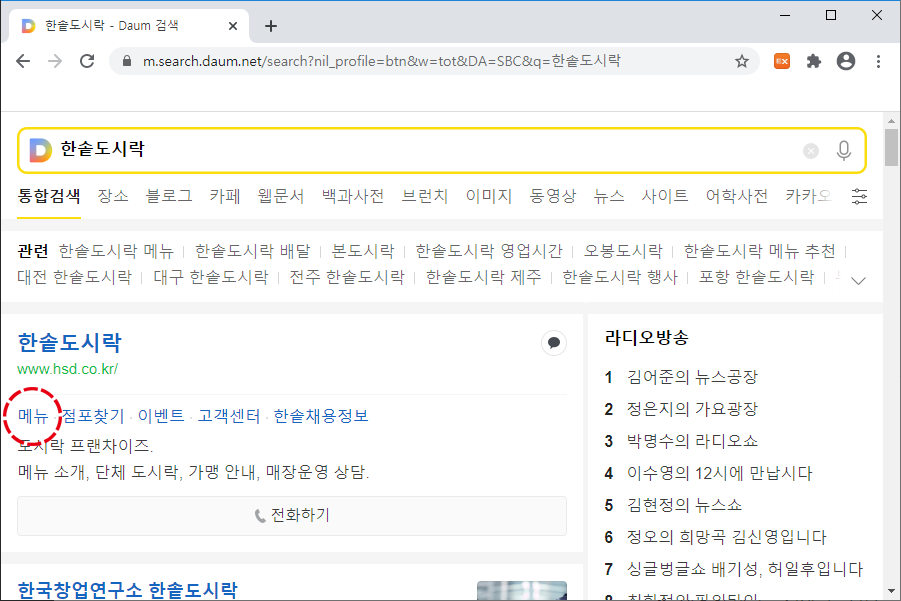 검색창에 '한솥도시락'을 검색해주시면, 위와 같이 메뉴 버튼이 나타나는데요. 해당 메뉴 버튼을 눌러주시면 한솥도시락 메뉴를 쉽게 확인할 수 있습니다.