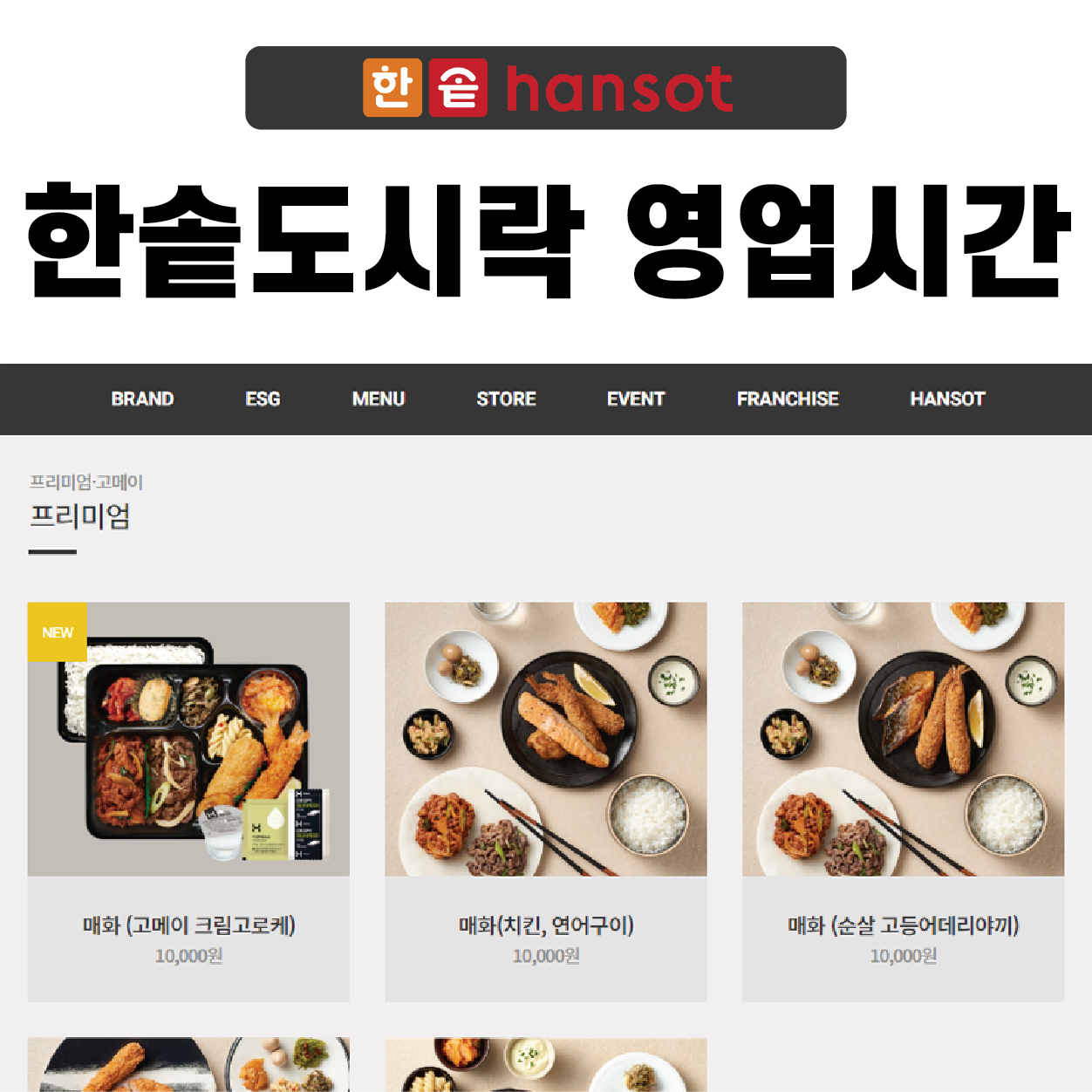 저는 평소 배는 고픈데 무언가 해 먹기는 귀찮을 때, 그렇다고 배달 음식은 먹기 싫고 밥다운 밥을 먹고 싶을 때 주로 한솥도시락을 이용하게 되는 것 같아요. 그런데 시간이 너무 이르거나 늦은 경우에는 한솥도시락 영업시간이 맞나..? 아닌가..? 헷갈리더라고요. 그래서 제가 한솥도시락 영업시간 아는 방법에 대해 알아봤는데요. 생각보다 매우 간단했습니다.