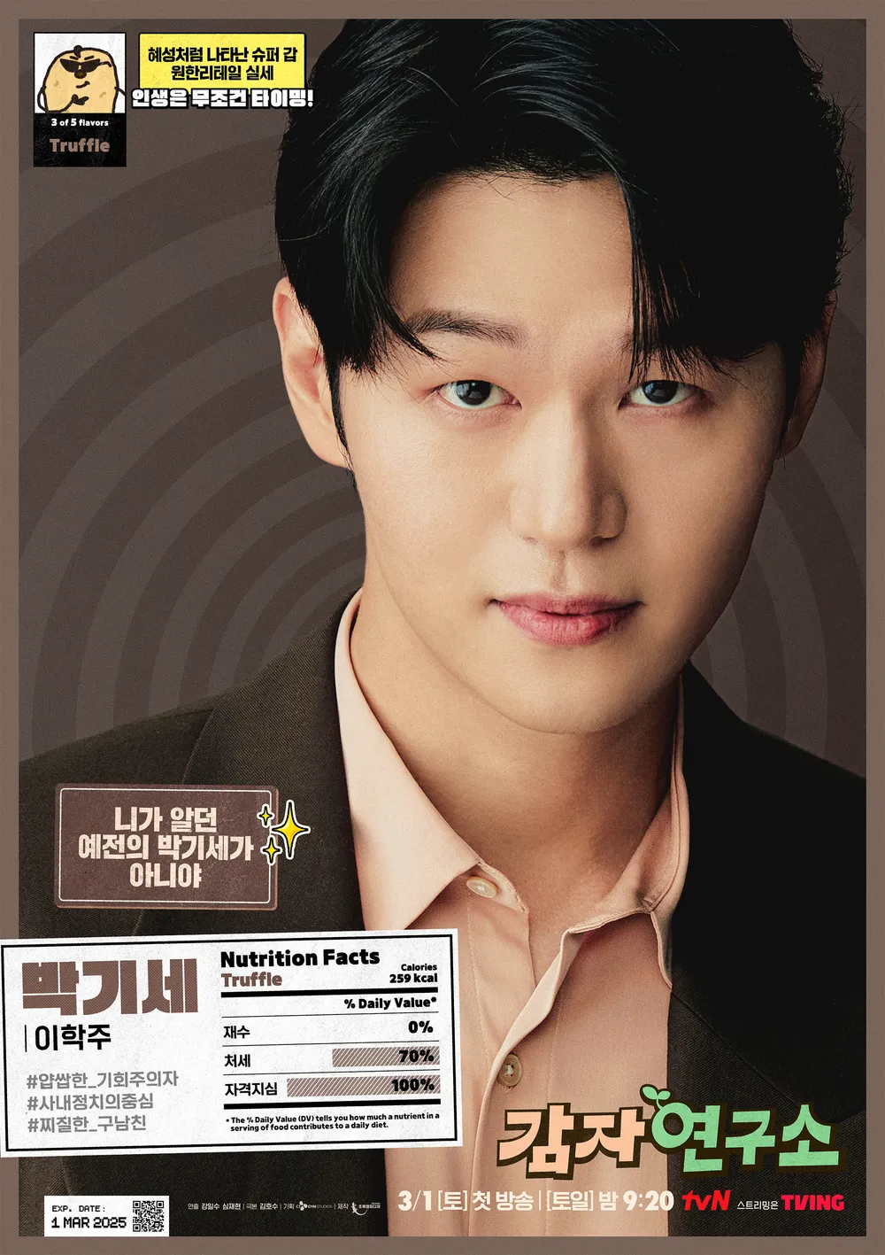 드라마 감자연구소는 3월 1일을 시작으로 매주 토요일과 일요일, 밤 10시 30분에 tvN 채널을 통해 관람하실 수 있는데요. 다시 보기는 OTT 티빙과 넷플릭스를 통해 가능하다고 하니 참고해 주세요!