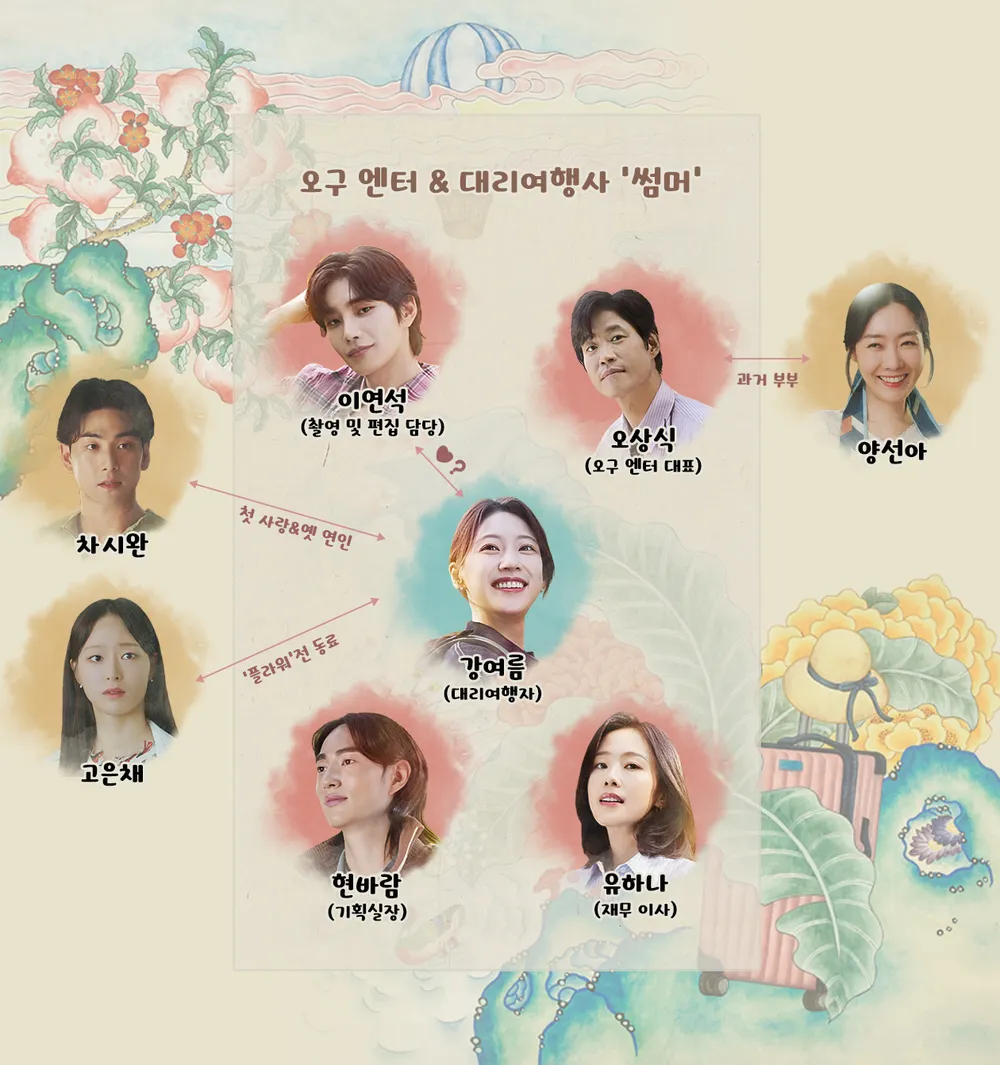 극 중 전직 아이돌이자 전직 여행 리포터 강여름 역은 배우 공승연이, 오구 엔터 대표 오상식 역은 배우 유준상이, 촬영 및 편집 담당 이연석 역은 배우 김재영이 맡았습니다. 이 외에도 오구 엔터 재무이사 유하나 역은 배우 홍수현이, 오구 엔터 기획실장 현바람 역은 배우 오현종이 맡아 다섯 명의 캐미스트리를 보여줄 것으로 기대되고 있어요.