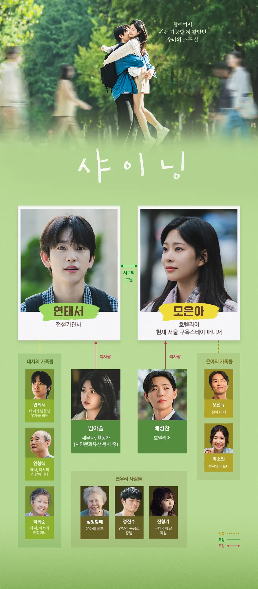 드라마 샤이닝은 세상에 둘뿐이었던 것 같던 고등학교 도서관의 기억을 공유한 두 사람이, 각자의 방식으로 고립을 선택했다가 다시 서로를 통해 세상을 향해 나아가는 과정을 섬세하게 묘사합니다. 감성과는 거리가 멀어 보였던 태서가 은아 앞에서만 보여주는 가늠할 수 없는 사랑과 이해, 그리고 삶의 갈림길마다 태서라는 이정표를 찾아가는 은아의 재회는 시청자들에게 따뜻한 위로를 전하는 것 같아요.