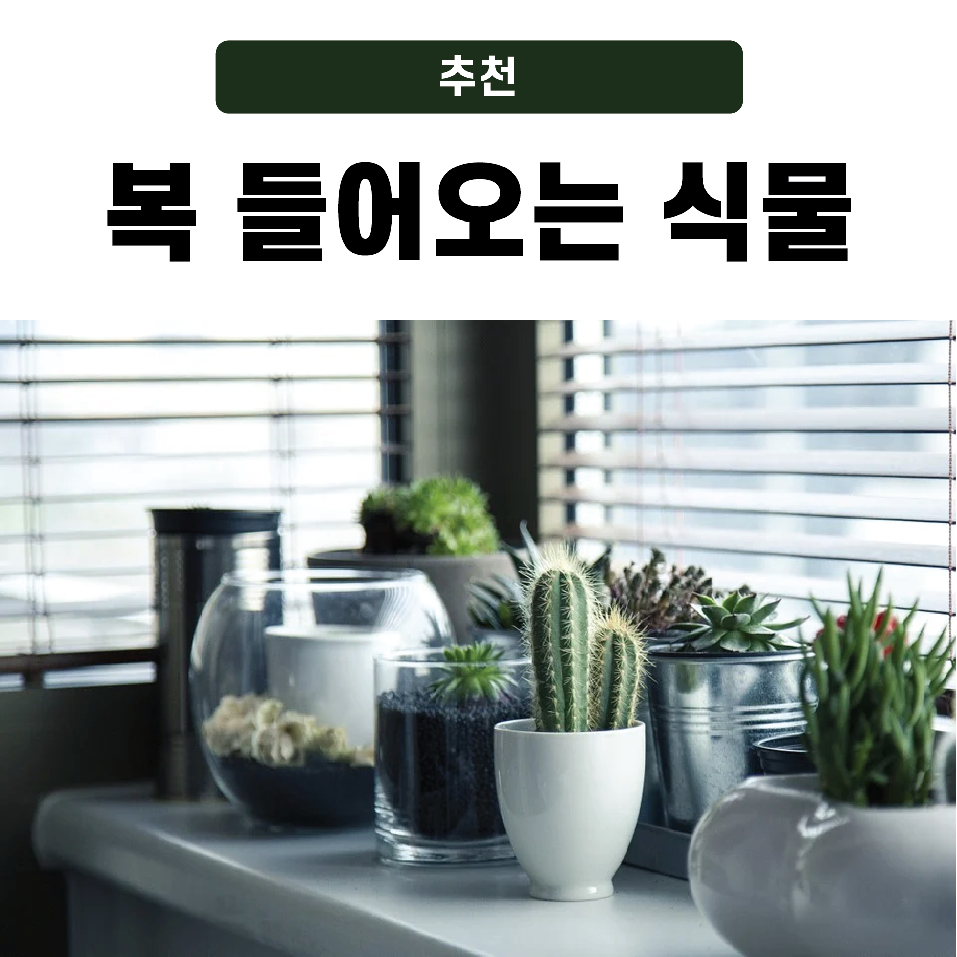 플랜테리어(식물을 이용한 인테리어)가 유행하기 시작하면서, 식물 키우기에 대한 관심도 높아진 요즘입니다! 때문에 요즘 집에서 키울 식물을 알아보고 있어요. 어차피 식물을 키울 거라면 복들어오는 식물을 키우고 싶은 마음, 다들 공감하시죠?