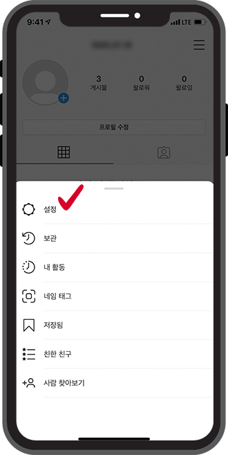 메뉴를 터치해주시면 설정, 보관, 내 활동, 네임 태그, 저장됨, 친한 친구, 사람 찾아보기 등의