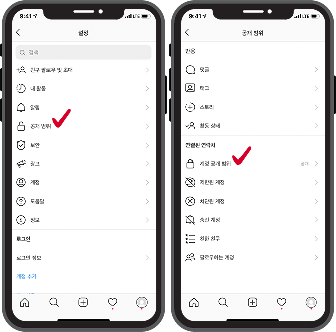 마찬가지로, 메뉴 - 설정 - 공개 범위 - 계정 공개 범위 페이지로 들어가