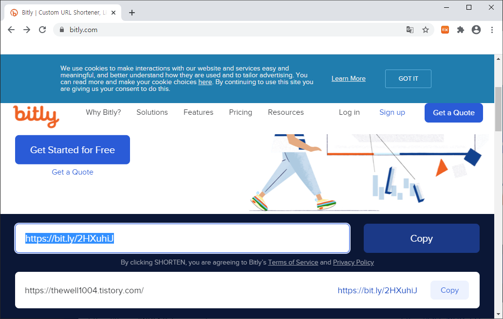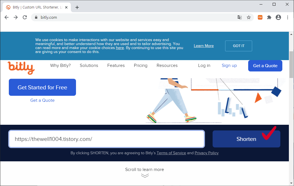 저는 저의 블로그 주소를 입력해보았습니다. 길이를 줄이고 싶은 링크를 입력한 후에는 오른쪽의 Shorten 버튼을 클릭해주시면 됩니다.