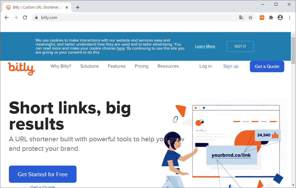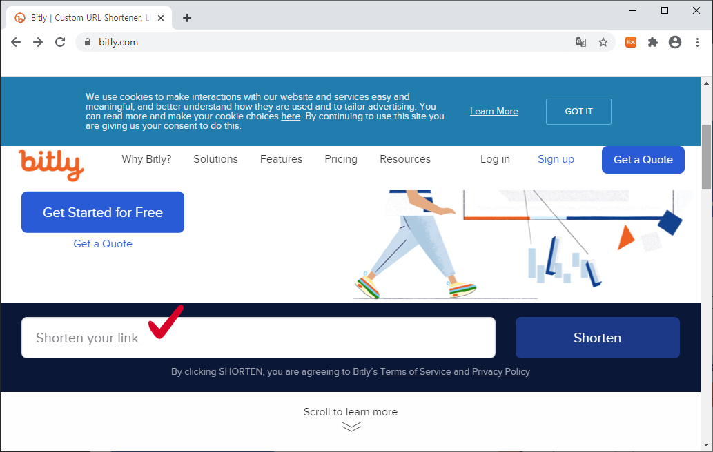 URL을 단축하기 위해서는 먼저 비틀리(bitly.com/)로 접속을 해주셔야 합니다. 인터넷 주소창에 앞에 나와있는 비틀리 홈페이지 주소를 입력해주신 후, 엔터를 눌러주시면 쉽게 접속하실 수 있습니다.