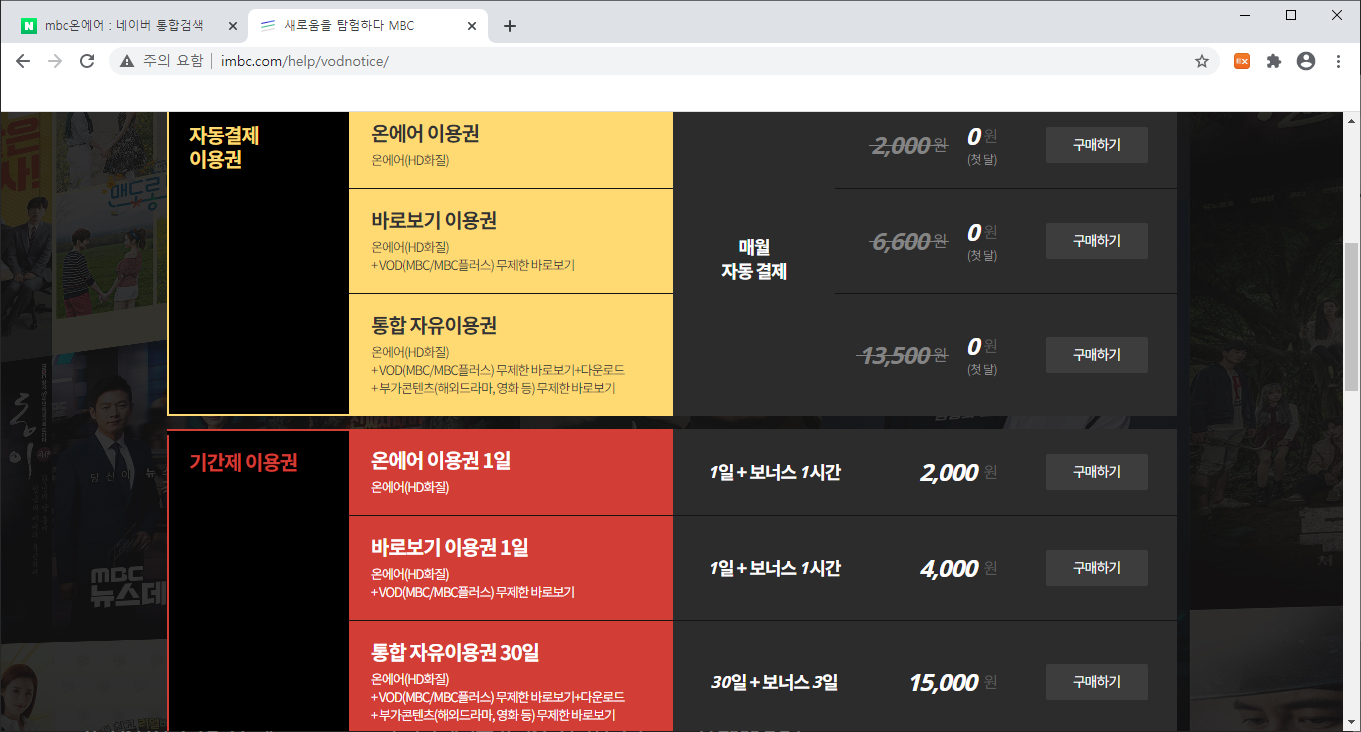 MBC 온에어 이용권 종류입니다. 자동결제 이용권과 기간제 이용권이 있습니다.