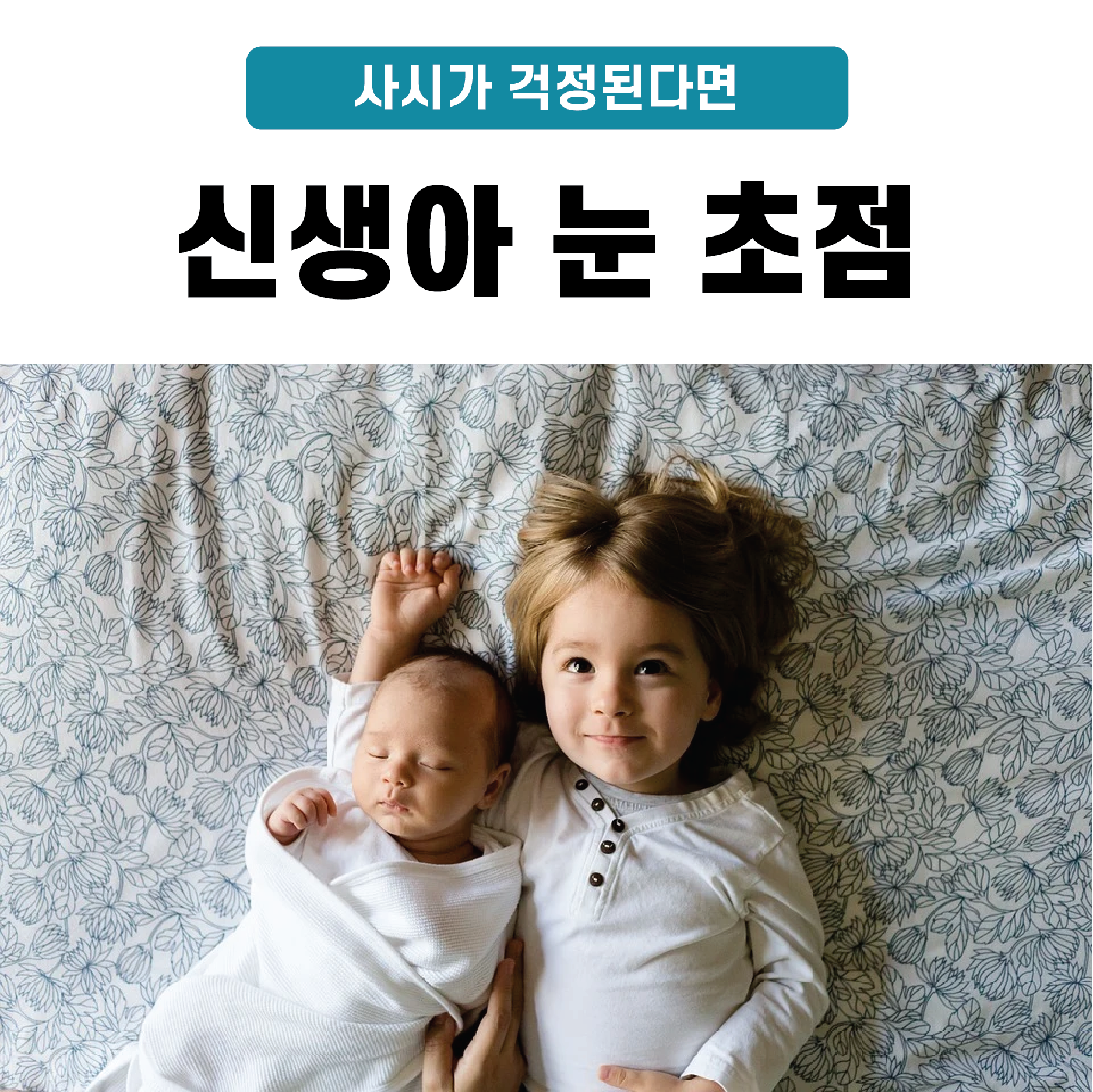 아이를 처음 가져보신 분들은 아이가 태어난 후, 눈 초점 때문에 당황하는 일이 발생할 수 있습니다. 신생아 눈 초점을 보면 대부분 초점이 없는 것처럼 느껴지기 때문인데, 생각지 못했던 부분이다 보니 '우리 아이가 사시는 아닐까?' 하는 걱정이 앞서게 됩니다.