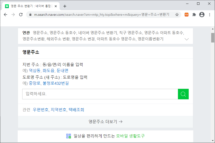 영문주소 변환기를 검색해주시면 위와 같이 영문 주소 변환 페이지가 나타납니다. '입력하세요.'라고 적힌 곳을 봐주시기 바랍니다.