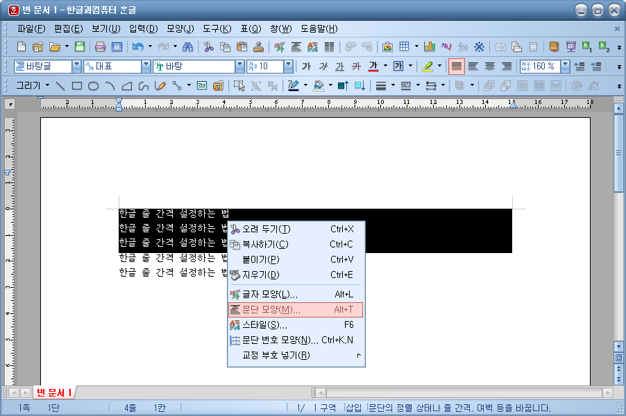 한글 줄간격 설정 두 번째 방법입니다. 위에서 알려드린 방법 외에도 한 가지 방법이 더 있습니다. 마찬가지로 한글 줄간격 설정을 해줄 구간을 선택해주셔야 합니다.