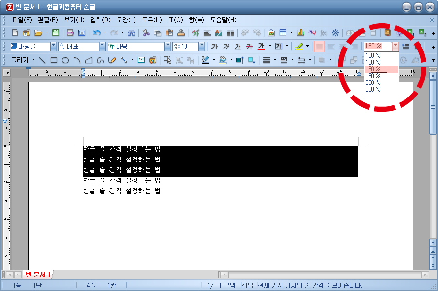 원하는 부분을 선택해주신 뒤에는 한글 프로그램 오른쪽 상단을 봐주시기 바랍니다. 오른쪽 상단의 표시해놓은 곳을 봐주시면 줄 간격 설정 항목이 있습니다. 해당 부분을 클릭해보시면 100%, 130%, 160%, 180%, 200%, 300% 등이 있는데, 여기서 원하는 줄 간격을 선택해주시면 되겠습니다.