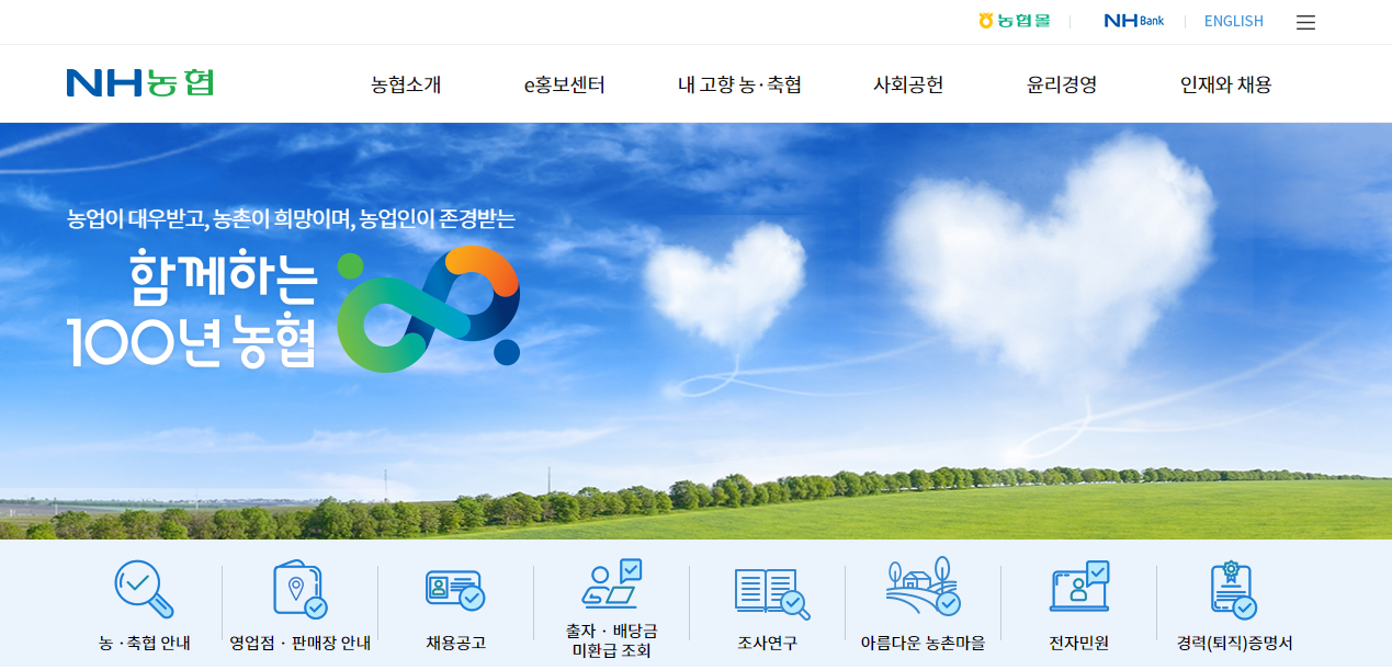농협 공식 홈페이지의 모습입니다. 위에는 농협 소개, e홍보센터, 내 고향 농·축협, 사회공헌, 윤리경영, 인재와 채용 등의 카테고리가 보입니다. 아래에는 농·축협 안내, 영업점·판매장 안내, 채용공고, 출자·배당금 미환급 조회, 조사연구, 아름다운 농촌마을, 전자민원, 경력(퇴직) 증명서 등 많은 사람들이 찾는 것으로 보이는 메뉴들이 있습니다.