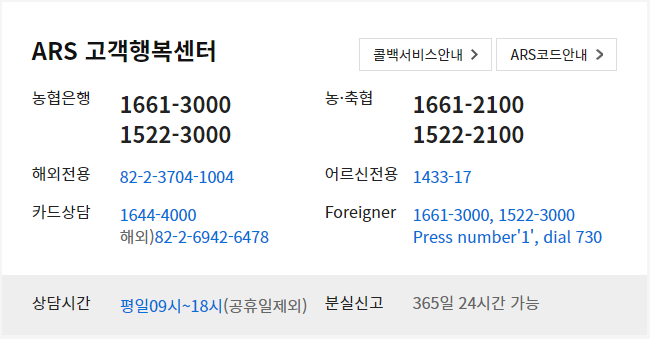 농협 공식 홈페이지를 통해 농협 고객센터 전화번호에 대해 알아보았습니다. 농협 고객센터 전화번호는 하나가 아니기 때문에, 자신의 상황에 따라 알맞은 전화번호를 이용해주셔야 합니다. 농협은행은 1661-3000, 1522-3000 / 농·축협은 1661-2100, 1522-2100 / 해외 전용은 82-2-3704-1004 / 어르신 전용은 1433-17 / 카드상담은 1644-4000 (해외는 82-2-6942-6478)입니다.