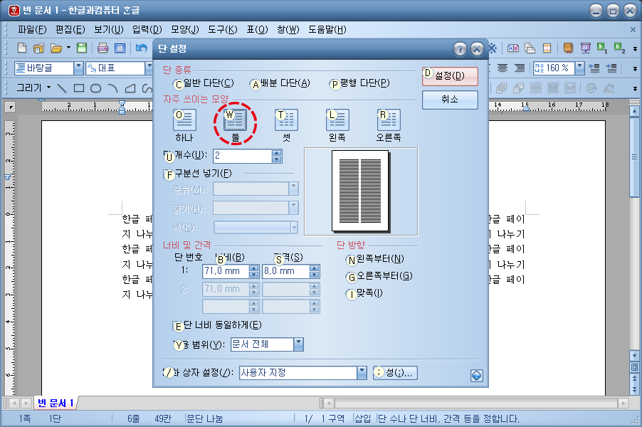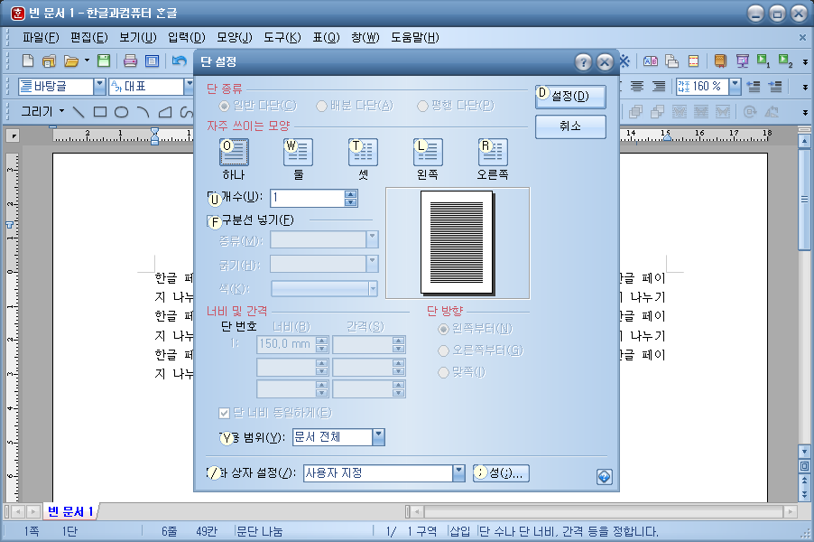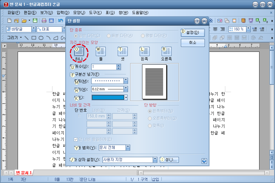 단 설정 창이 띄어진 모습입니다. 단 설정 창의 자주 쓰이는 모양 항목을 봐주시기 바랍니다. 하나, 둘, 셋, 왼쪽, 오른쪽 등 다섯 개의 항목이 있습니다. 하나는 말 그대로 한 페이지 그대로 작업하는 것, 둘은 페이지를 두 영역으로 나누어 작업하는 것, 셋은 페이지를 세 영역으로 나누어 작업하는 것을 말합니다.