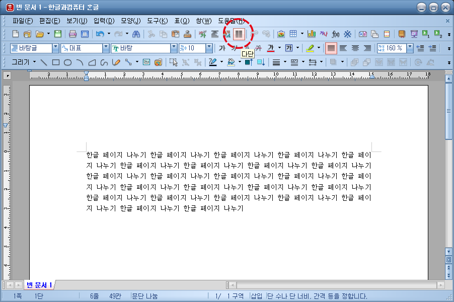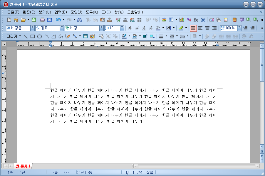 방법을 알려드리기 위해, 먼저 한글 페이지 나누기라는 문장을 나열해보았습니다. 일반적으로는 한글 프로그램에서 글씨를 작성하게 되면 위와 같이 글자가 나열됩니다.