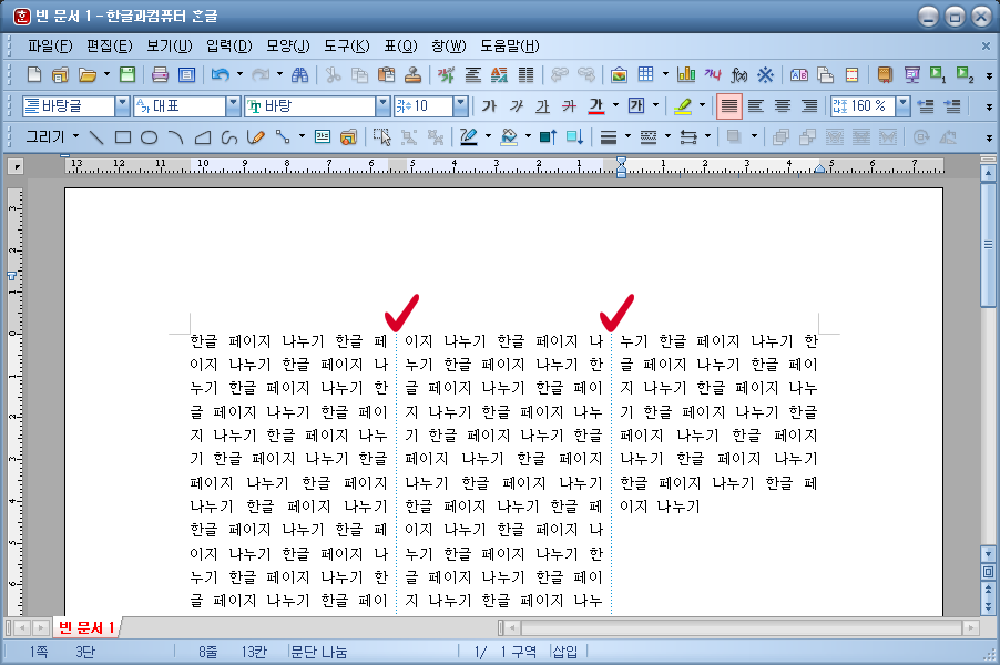 이번에는 한글 페이지 나누기를 셋으로 설정해보았습니다. 영역이 세 개로 나뉘었습니다.