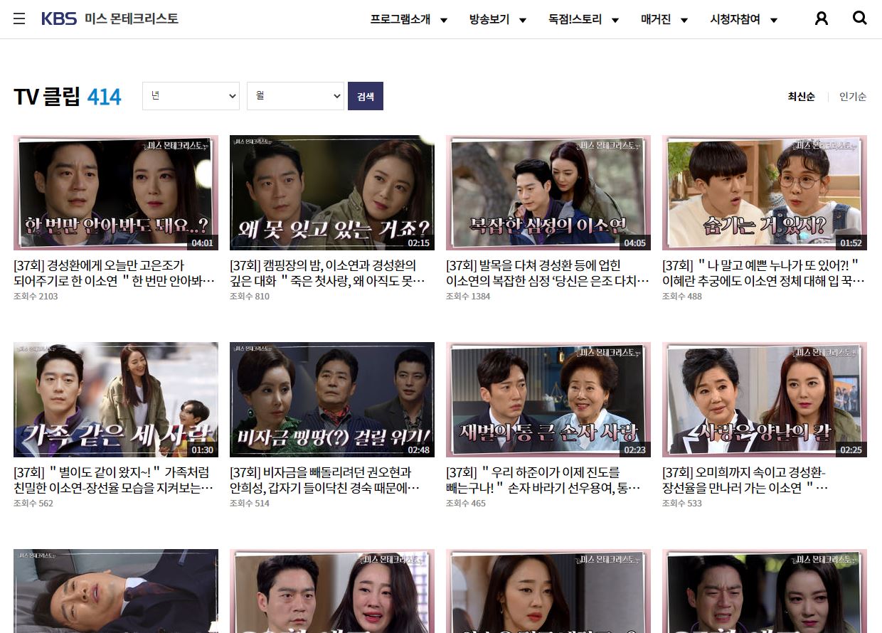 KBS 공식 홈페이지를 통해 미스 몬테크리스토 프로그램 정보, 등장인물, 방송 미리 보기, 방송 다시 보기, TV 클립 등을 확인할 수 있습니다. KBS 외에는 웨이브를 통해 미스 몬테크리스토 다시 보기가 가능합니다.