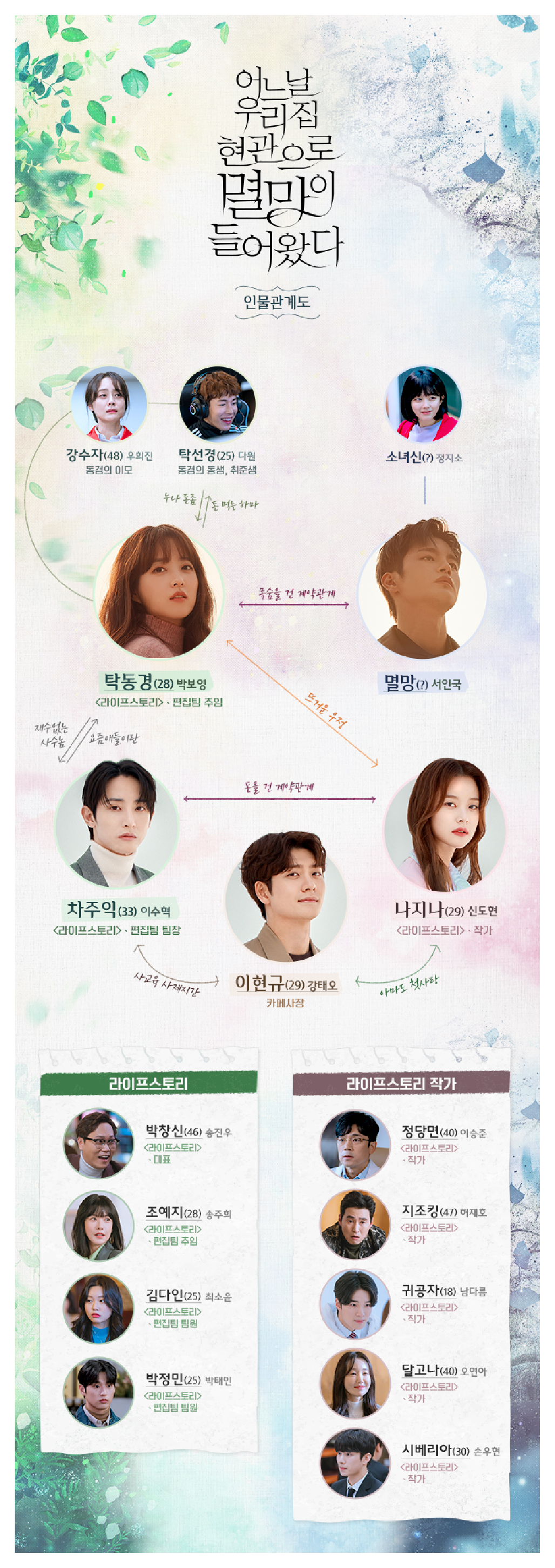 '어느 날 우리 집 현관으로 멸망이 들어왔다' 인물관계도입니다. '어느 날 우리 집 현관으로 멸망이 들어왔다'는 만화 같은 제목으로 인해 웹툰 또는 소설 원작으로 알고 계시는 분들도 많은데요. JTBC 드라마 '뷰티 인 사이드'를 집필했던 임메아리 작가의 오리지널 드라마입니다.