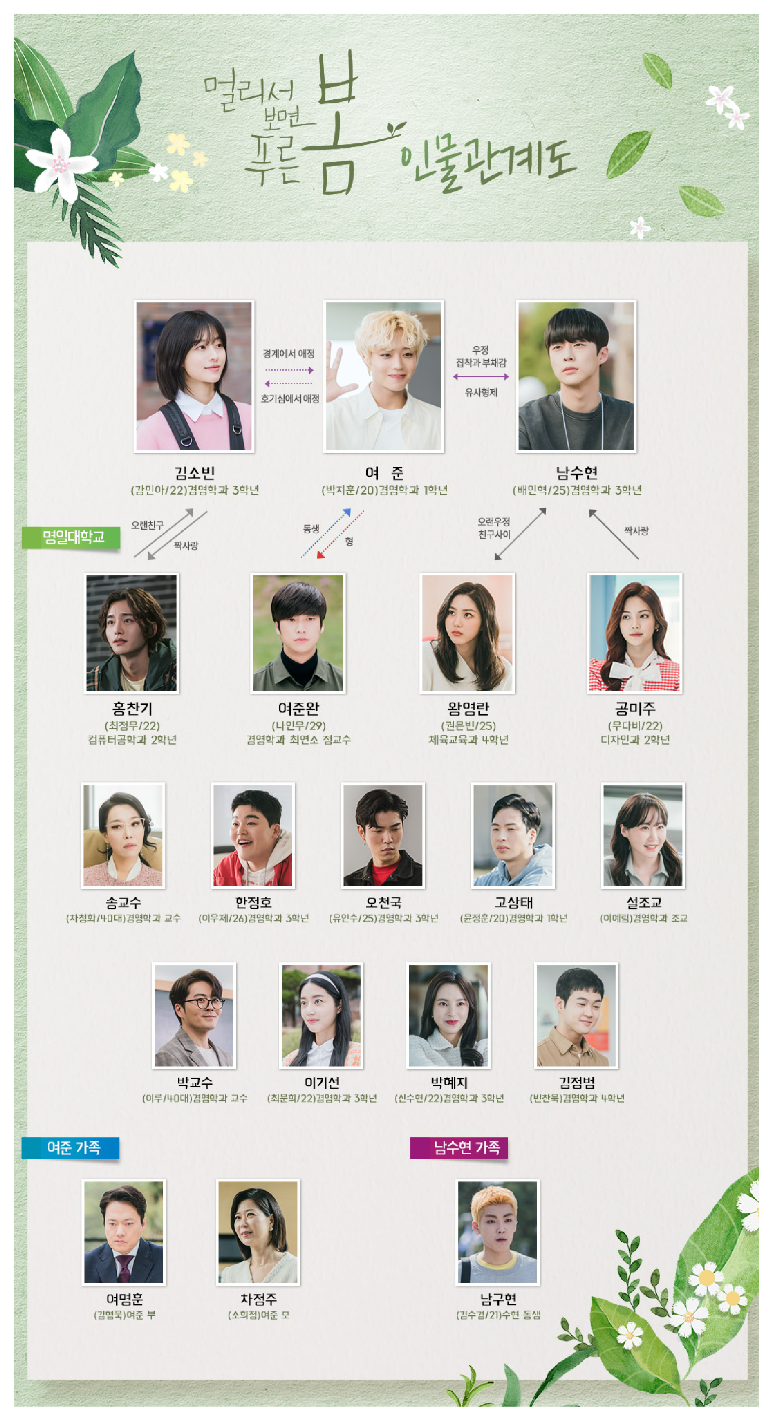 이도현과 고민시 주연의 드라마 '오월의 청춘'이 끝나고, 2021년 6월 14일 오후 9시 30분 부터는 새로운 드라마 '멀리서 보면 푸른 봄'이 방송됩니다. '멀리서 보면 푸른 봄'은 동명의 다음 웹툰이 원작인데요. 대학판 미생이라는 평가를 받고 있는만큼 많은 기대가 되는 작품입니다. 주연 배우는 강민아, 박지훈, 배인혁이 맡았습니다.