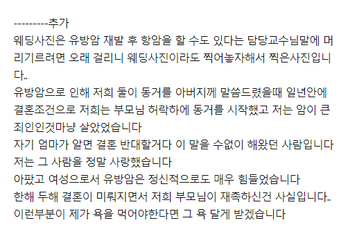 위에서 보았던 웨딩 사진은 글쓴이가 유방암 재발 후 항암을 할 수 있다는 담당 교수님의 말에, 머리를 기르려면 오래 걸리니 웨딩 사진이라도 찍어놓자 해서 찍었던 사진이라고 합니다. 유방암으로 인해 둘의 동거를 아버지께 말씀드렸고, 1년 안에 결혼하는 조건으로 부모님은 동거를 허락해주셨다고 하는데요.
