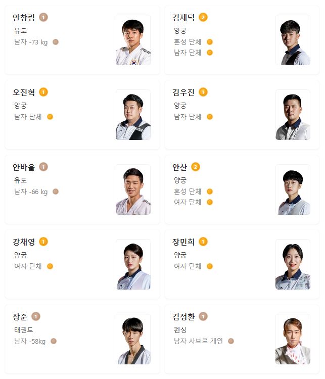 안산 선수는 문산 초등학교, 광주 체육 중학교, 광주 체육 고등학교를 졸업한 후 광주 여자 대학교 초등 특수 교육학과에 재학 중이며, 김제덕 선수는 예천 초등학교, 예천 중학교를 졸업한 후 경북일 고등학교에 재학 중입니다.