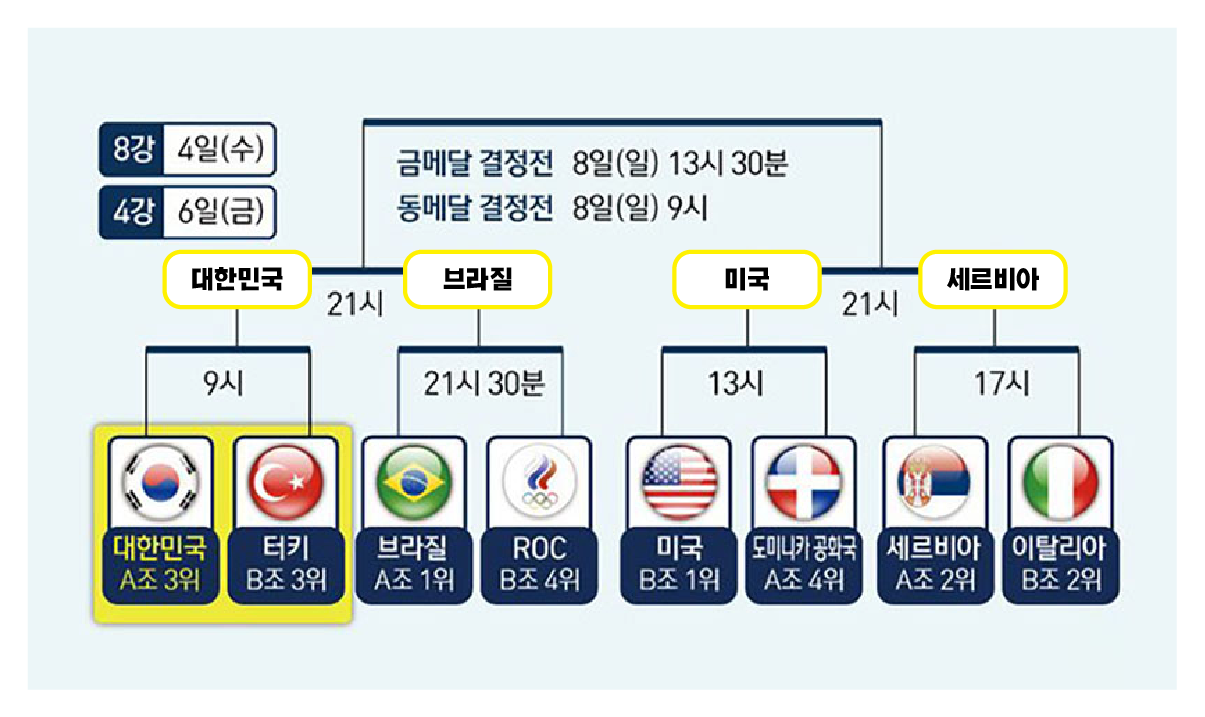 그리고 같은 날 미국 vs 세르비아의 4강전 경기도 진행됩니다. 이어 우리나라 vs 브라질 경기에서 이긴 팀, 미국 vs 세르비아 경기에서 이긴 팀은 8월 8일 일요일 오후 1시 30분 금메달 전을 진행합니다. 그리고 진 팀끼리는 같은 날 오전 9시 동메달 결정전 경기를 진행합니다. 시간 순으로 정리하자면 아래와 같습니다.