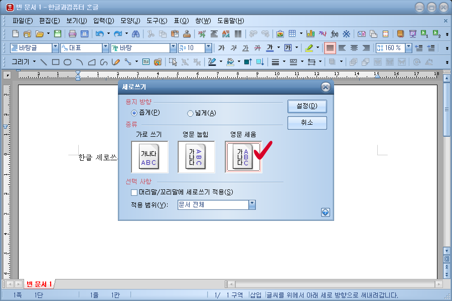 원하는 설정을 모두 마치셨다면, 세로쓰기 창 오른쪽 상단에 있는 설정 버튼을 클릭해주시면 됩니다.