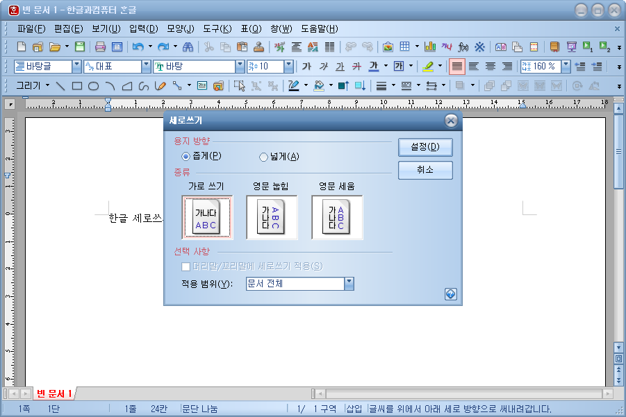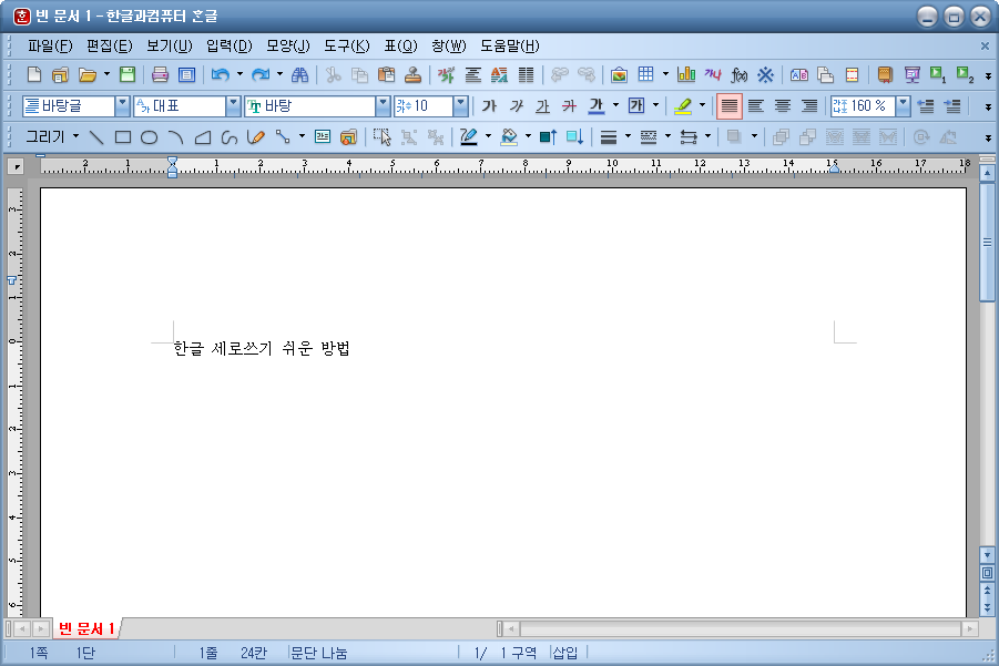 한글 세로쓰기 창이 실행되었을 때의 화면입니다.