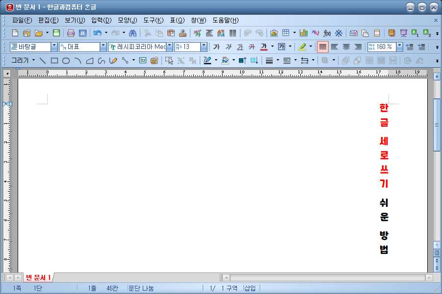 한글 프로그램을 실행시킨 뒤, 한글 세로쓰기 쉬운 방법이라고 적어보았습니다.