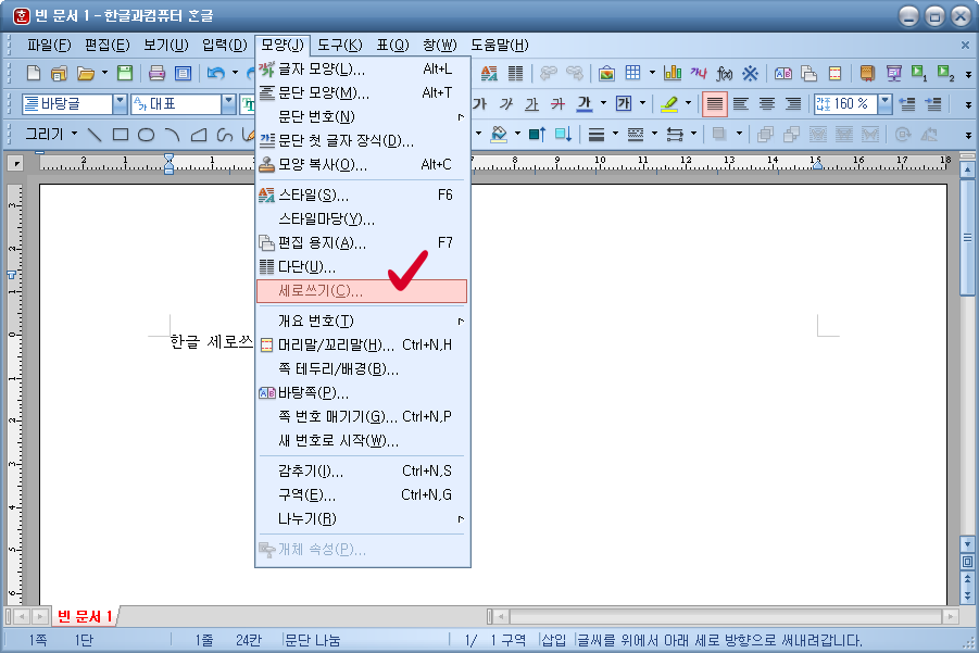 세로 쓰기 항목을 발견하셨다면 클릭하여 세로 쓰기 창을 실행시켜주세요.