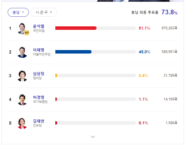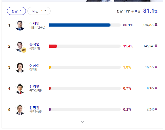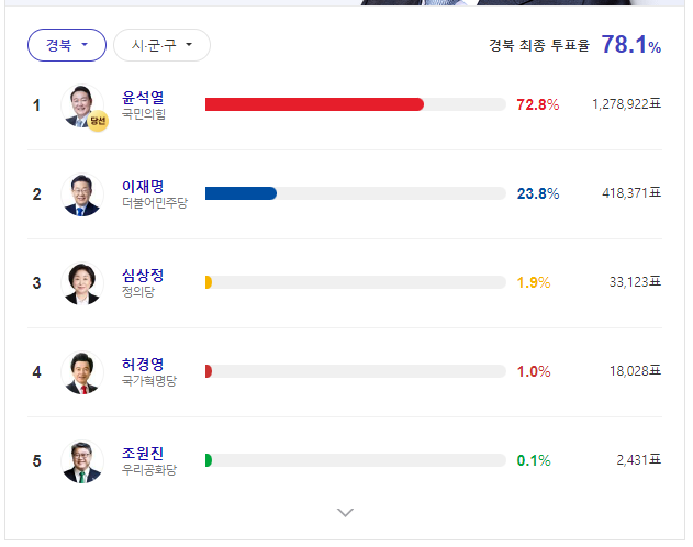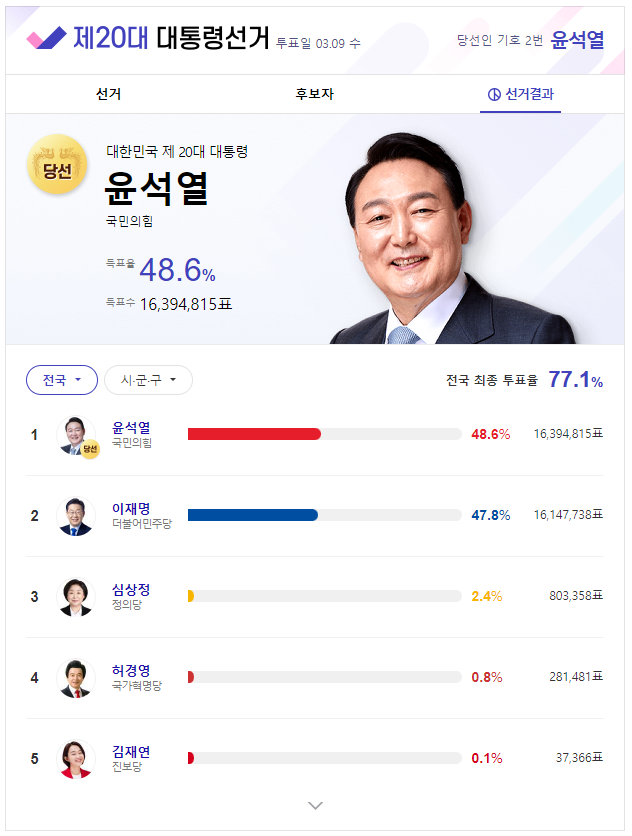 바로 어제 진행된 2022년 제20대 대통령 선거에서 기호 2번이었던 윤석열 당선인이 득표율 48.6%로 1위에 올랐습니다. 그리고 기호 1번 이재명 후보는 득표율 47.8%로 2위에 머물렀는데요. 윤석열 당선인은 총 16,394,815표, 이재명 후보는 총 16,147,738표로 겨우 247,077표 차이밖에 나지 않았습니다.