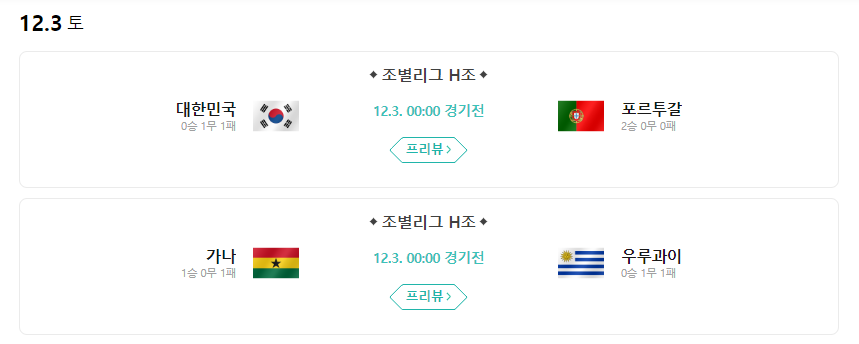 현재 대한민국은 H조 순위 3위를 기록하고 있는데요. 금요일에서 토요일로 넘어가는 밤 12시 경기를 통해 16강 진출 유무가 결정됩니다. 토요일 0시에는 대한민국과 포르투갈, 가나와 우루과이의 경기가 동시에 진행될 예정이기 때문에 3일 토요일 오전 2시 정도가 되면 H조의 16강 진출국이 확실히 되겠네요.