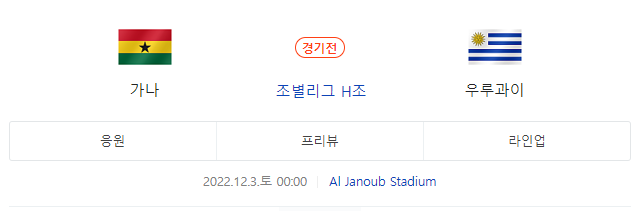 2022 카타르 월드컵이 진행 중입니다. 우리나라는 앞서 있었던 H조 조별리그에서 가나와의 경기는 0:0 무승부, 포르투갈과의 경기에서는 3:2로 패를 했는데요. 우리나라의 승 1무 1패의 결과가 나타나면서 나머지 한 경기에 대한 관심이 매우 높아지고 있습니다.