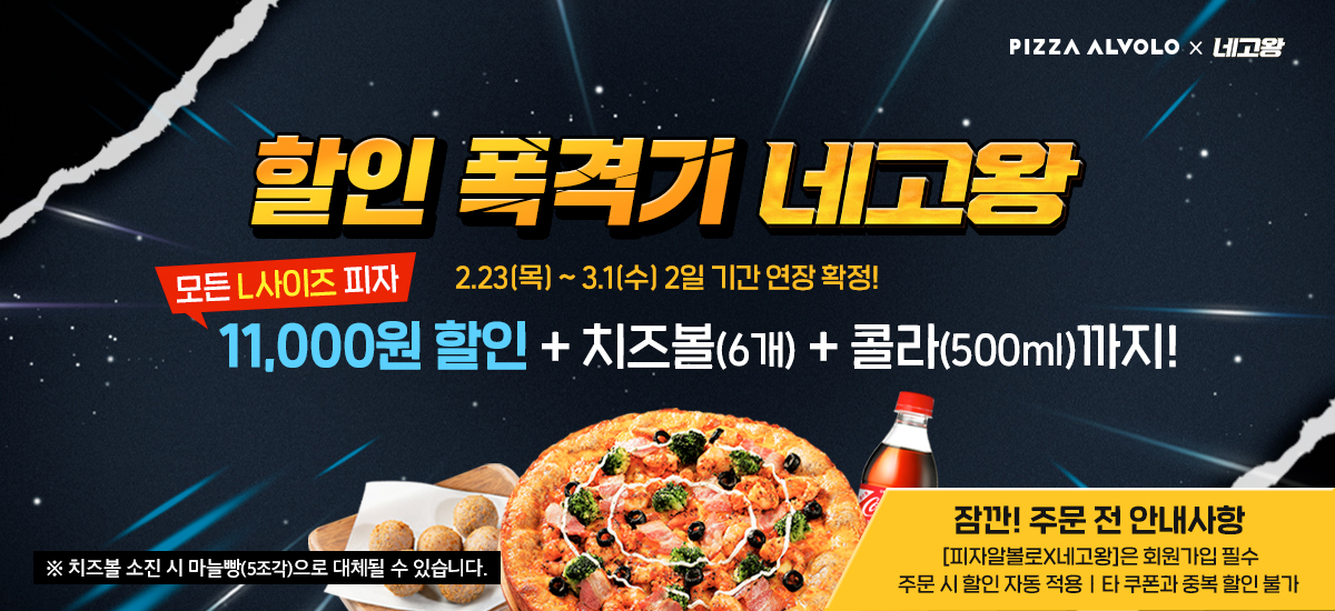 1. 피자알볼로 L(라지) 사이즈 전 메뉴 주문시 11,000원 할인