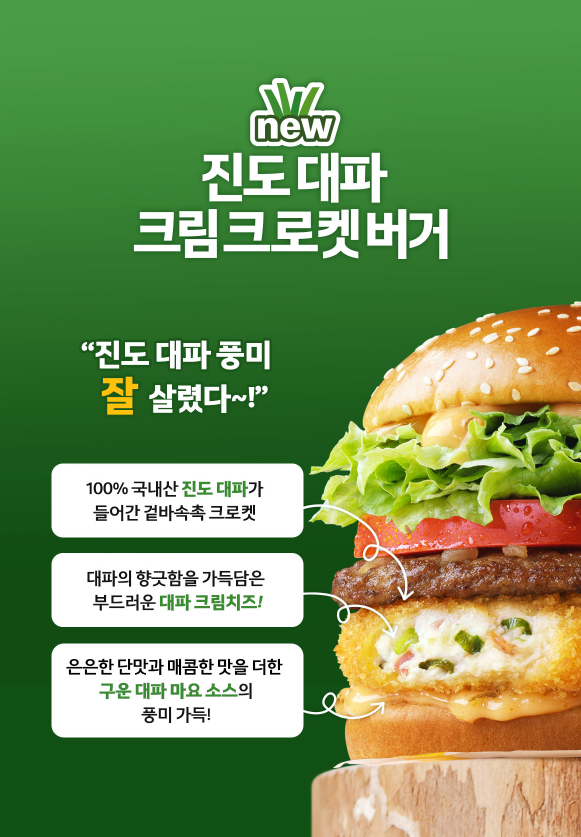 맥도날드 진도 대파 크림 크로켓 버거는 100% 국내산 진도 대파가 들어간 겉바속촉 크로켓에 구운 대파 마요 소스로 풍미 가득한 맛을 냈다고 하는데요.