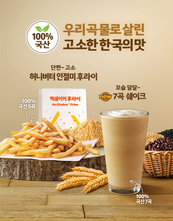 허니버터 인절미 후라이 가격은 스몰 2,000원 / 미디움 2,700원 / 라지 3,400원이며 기본 감자튀김 가격에서 700원을 추가 시에도 이용할 수 있다고 합니다. 그리고 7곡 쉐이크 가격은 미디움 기준 3,400원이며 기본 세트에서는 1,500원을 추가 시 이용할 수 있다고 해요.