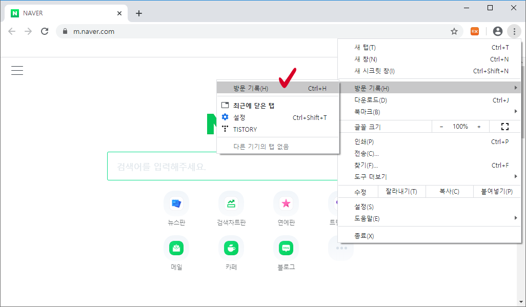 또한, 간단하게 키보드 단축키 Ctrl + H 를 눌러주셔도 방문 기록 페이지로 접속하실 수 있습니다.