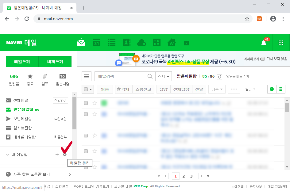 톱니바퀴 모양의 아이콘(메일함 관리)을 발견하셨다면 클릭해주세요.