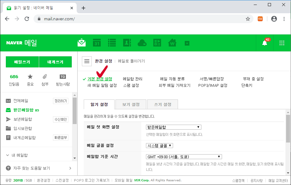 메일함 관리 페이지로 들어가주신 뒤에는 맨 첫 번째에 있는 기본 환경 설정을 클릭해주시면 됩니다.