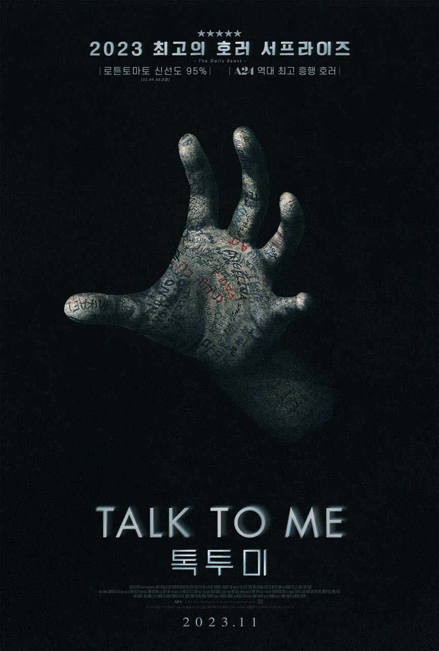 톡투미(Talk to Me) 그대로 해석하면 '나에게 말해'라는 뜻을 가지고 있어요. 영화 톡투미는 죽은자의 손을 잡고 귀신을 부르는 '빙의 챌린지' 영상이 인기를 끌면서 일어나는 일을 그렸다고 하는데요. SNS에서 핫한 빙의 챌린지에 중독되어 위험한 게임을 이어나가다, 정해진 규칙을 어겨버리는 바람에 귀신에게 빙의되어 끔찍한 경험을 하게 되는 내용을 담고 있다고 합니다.