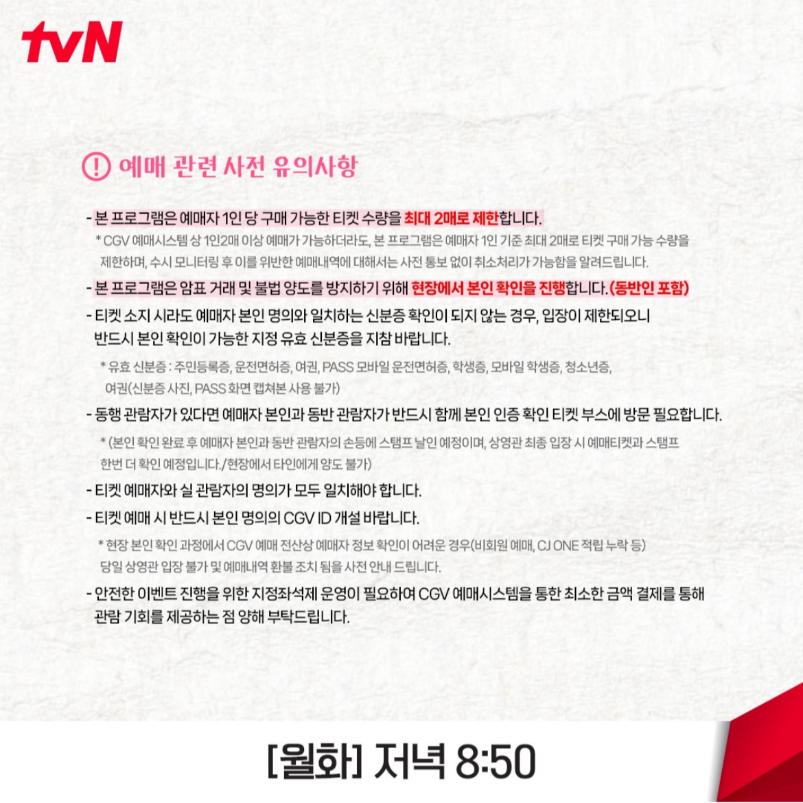 선재 업고 튀어 마지막화 단체관람 예매 고객은 본인 확인이 완료된 분에 한해 오후 7시 40분부터 입장이 시작된다고 합니다. 7시 50분부터 본 방송 시작 시간인 8시 50분 까지는 <선재 업고 튀어> 드라마 관련 콘텐츠가 송출되며, 무대인사 진행 시에는 영상 송출이 중단될 예정이라고. 관련 콘텐츠는 방송에 나오지 않은 내용일까요? 어떤 관련 콘텐츠가 나올지도 매우 궁금하네요 :)