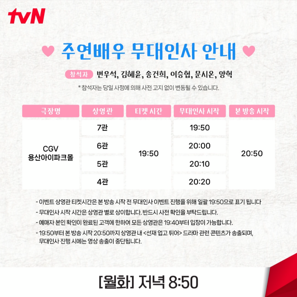 선업튀 단체 관람이라니.. 너무 재미있을 것 같다는 생각이 드는데요. 단순히 단체 관람만 하는 것은 아니고, 주연배우들의 무대인사도 진행될 예정이라고 해요! 현재 알려진 무대인사 참석자는 변우석, 김혜윤, 송건희, 이승현, 문시온, 양혁 배우입니다. 다만 참석자는 당일 사정에 의해 사전 고지 없이 변동될 수 있다고 해요.