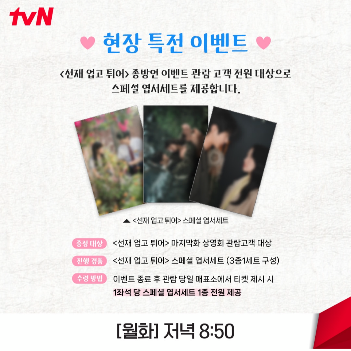 뿐만 아니라 현장 특전 이벤트까지! 선재 업고 튀어 종방연 이벤트 관람 고객 전원 대상으로 스페셜 엽서세트를 제공한다고 합니다. 마지막화 상영회 참석하시는 분들은 선재 업고 튀어 스페셜 엽서 세트도 꼭 받아 가세요~! 스페셜 엽서세트는 이벤트 종료 후, 관람 당일 매표소에서 티켓 제시 시 1 좌석 당 스페셜 엽서 세트 1종을 제공한다고 해요. 매표소에서 직접 받아가야 하는 것이기 때문에, 깜빡하지 않도록 조심~