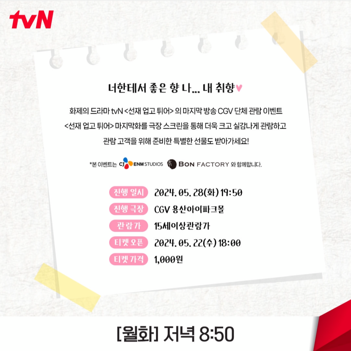 선재 업고 튀어 최종화 단체 관람 이벤트 날짜는 현재 기준 5일 뒤인 5월 28일입니다. 어제인 5월 22일 단체관람 티켓이 오픈되었으니 관심 있으신 분들은 서두르세요! 진행 극장은 CGV 용산아이파크몰이라고 하네요. 티켓 가격은 1,000원입니다.
