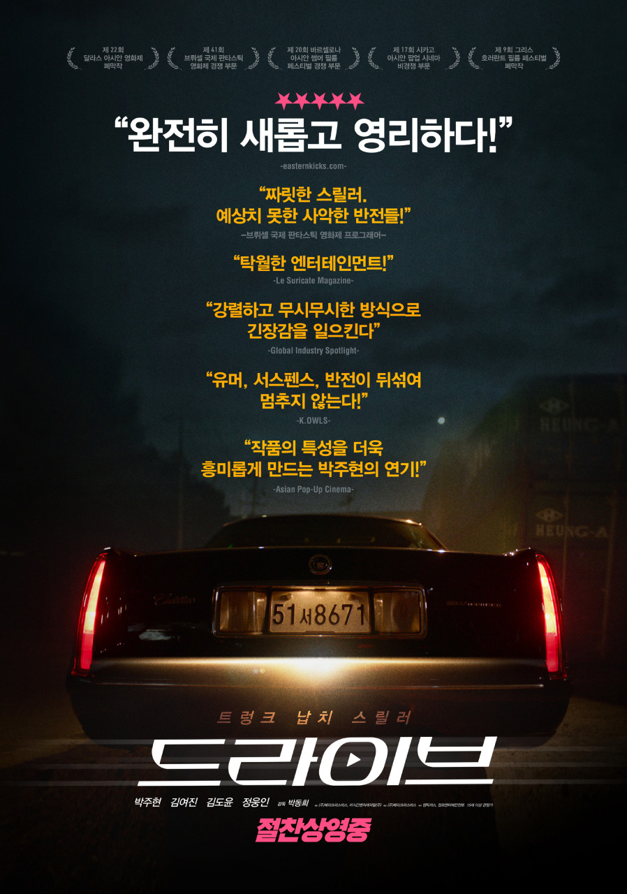 영화 드라이브 관람평을들 보면 '긴박함', '긴장감'이라는 단어가 많습니다. 장르가 스릴러인만큼, 해당 장르를 잘 살렸다는 생각이 들어요. 과거 넷플릭스 오리지널 드라마 <인간수업>에서도 연기를 인정받은 적 있는 배우 박주연이 <드라이브>에서는 또 어떤 모습을 보여줄지, 박주현 혼자 이끌고 가는 영화는 어떻게 다가올지 영화관에서 확인해봐야겠습니다.